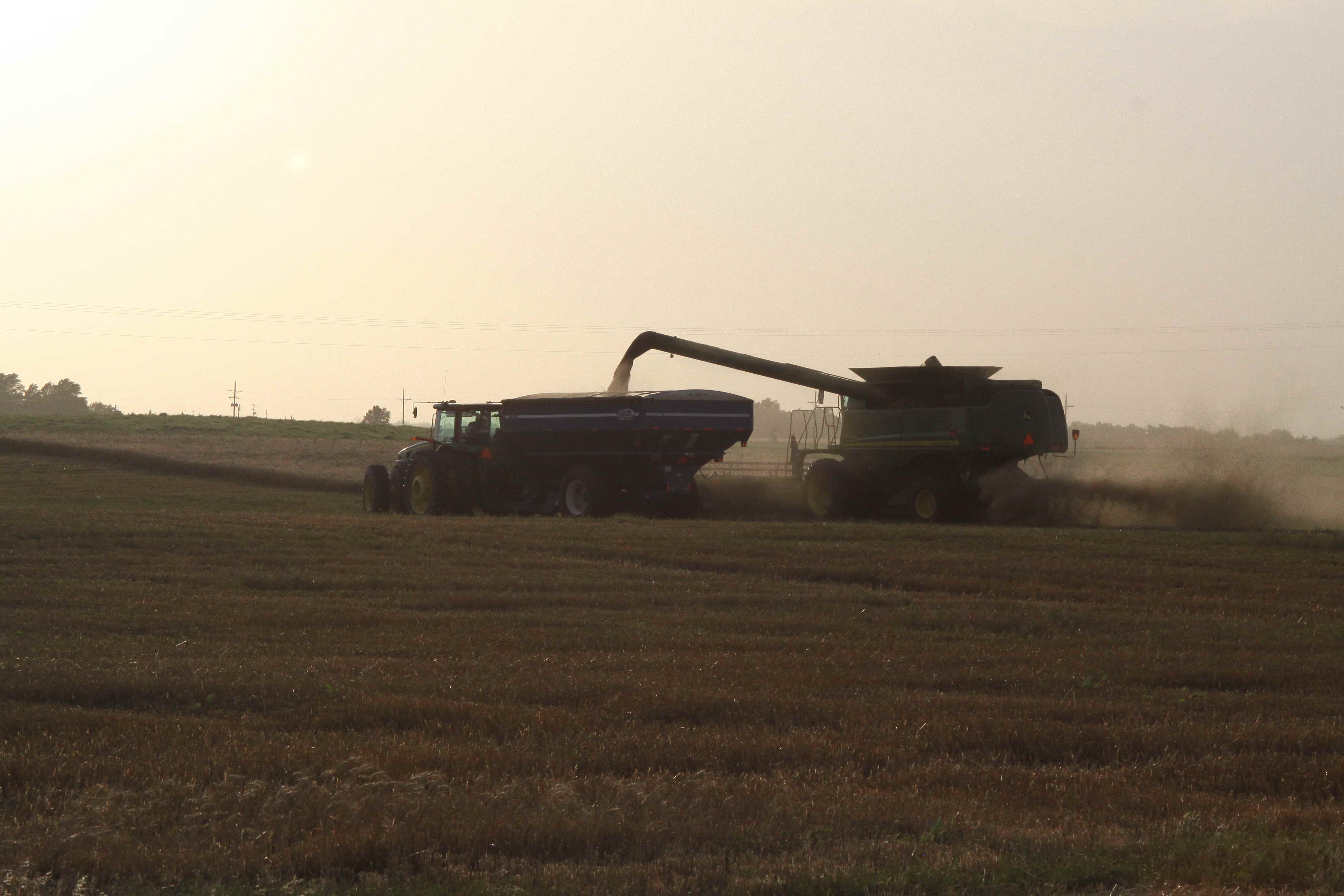 Wheat Harvest Tractor with grain bin and combine during wheat harvest